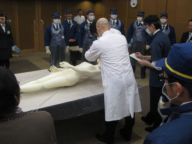 2011年10月23日 警察歯科医会研修会 今日は朝から夜まで、警察歯科医会研修会。 私は初めてではないんですが、なんだか以前よりすごく充実していて、 大変勉強になりました。 今回の震災時にも、このトレーニングはすごく役に立って、 山形チームは整然と仕事を行うことができたということでした。 ただトレーニングは必要ですが、 コレを実践する事態が来ないように祈るしかありませんなー。 白衣を着た後姿は、かの有名なDr.お気楽ですなー。 今日は大変、いや昨日から大変ご苦労様でした。