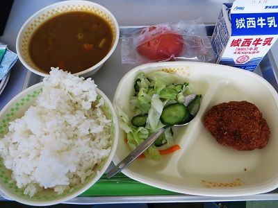 2015年06月11日 学校給食 今日は学校健診。 この地区はフッ素洗口を実施してきた、虫歯予防のパイオニア。 歯のきれいな生徒が多いです。 で、お昼は学校給食。 んー、久しぶりー。(一年ぶりですな) 今日は「ヒレカツ」。 当たり日でしたかな? 午前中は、さわやかな感じでしたが、 午後から予報通り気温が上がり、30度を超える真夏日でしたなー。