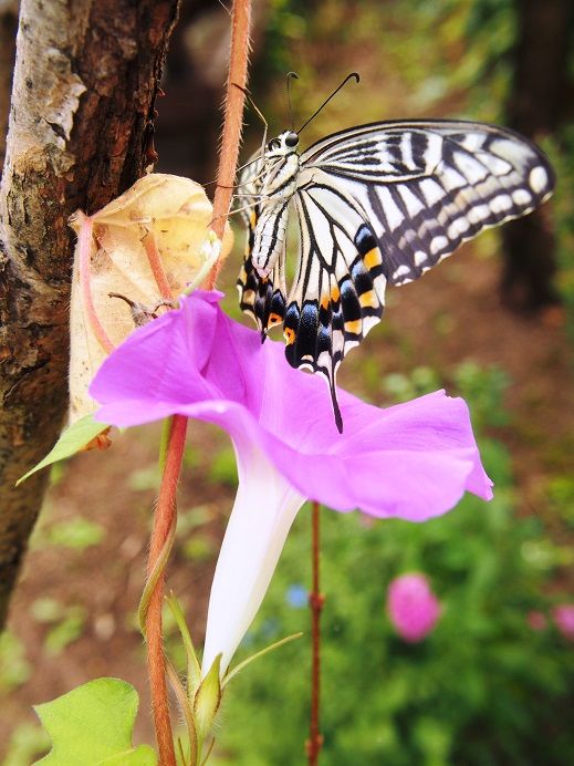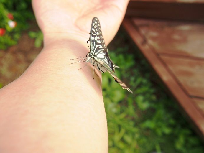 2014年09月06日 夏の終わり? 朝、庭にあんまり動けないようなアゲハ蝶・・・ んー、気温が下がって動けなくなったのかな? 後ろから指で押すと、トコトコ歩くので、 手の上に追ってみたら・・・ おお・・・、うまく乗りましたなー。 なんか、かわいい感じですなー。 絵的に、花のそばに移してみました。 あれ、なかなかいいんじゃないすか? へへ、一枚ゲッツ! 気温が上がったらどこかへ飛んでったみたいですなー。